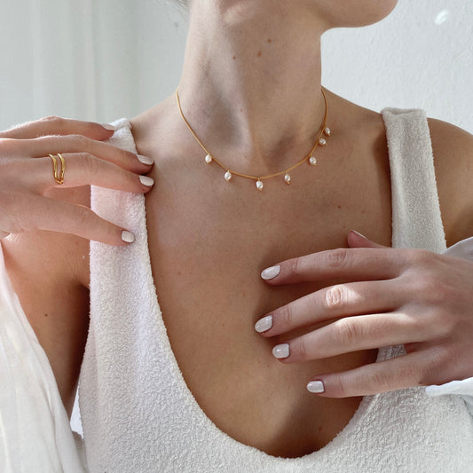 Highlights: Die Halskette Arosa kombiniert zarten Rosenquarz mit einer winzigen Süßwasserperle – ein charmantes Duo...